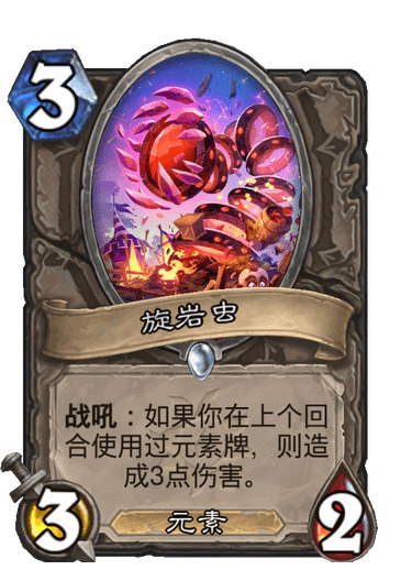 这张一费卡对整个卡组非常重要,能说的点太多了。首先作为一套节奏卡组,我们需要一费曲线上有一些生物,其次这张牌的战吼可以延续到二费回合(参考研习类法术的效果),而在二费就可以打出的旋岩虫或者旱地风暴 是很强的站场节奏。因为费用很低,很多时候我们还要用这张卡续起元素链为下回合可能打出的元素做准备。你也可以理解成如果你需要打的更有进攻性,这是一张可以“0费”扔上去的元素,我自己在玩的时候常常会遇到很多不同的情况,这一手是不是打出这张牌最好的时机也是我经常纠结的点。