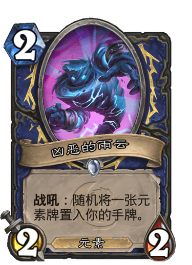凶恶的雨云是从砰砰计划回归核心系列的一张不错的二费生物。他不是一张非常强的单卡,但是整体质量还不错,也可以弥补一下二费曲线。在实战中的上限是战吼可以补充荷塘潜伏者或者火光元素这样的牌。对于我们这套牌来说,这张卡可以起到一个补充手牌资源的效果。