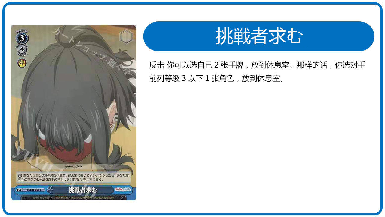 - 经验6 && 攻击宣言 -> 高潮联动(支付1费&&丢弃2张手牌):以下两个效果自己选择顺序发动 (1)观看对手卡组顶端两张卡片,选择其最多两张卡片入控制室,剩下的卡片根据自己喜欢的顺序摆放(2)造成两点伤害