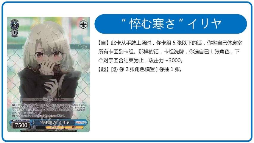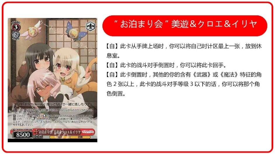 有如Hibiki老师在门裤伊莉雅的文章里说到,非常优秀的一个单卡也可以说比较超模的一个设计。登场回血,三级相杀,倒置对手角色后可以回到手牌。苟活的时候你不会想去支抽(因为需要保住血线),这张卡基本上不会对手牌有负担(因为打完会回来),所以这张卡同时解决了这个问题: 在不消耗手牌的情况下苟活(回血并且有可能不需要支抽)。