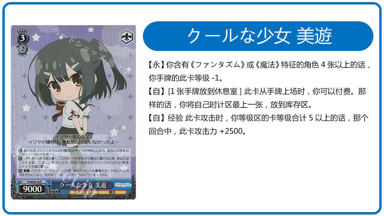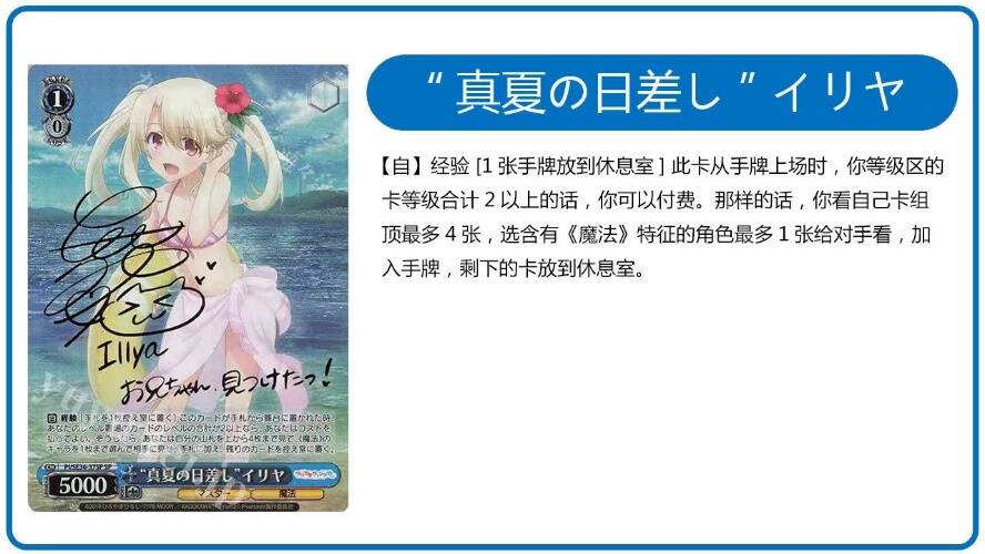会魔法的小学生有谁能不爱,我这里也比较同意Hibiki老师在他门裤伊莉雅文章中的看法“整体来说不算是质量非常过硬的强度卡组”和“非常适合在多轮次的瑞士轮中减少体力脑力消耗”。碍于1级联动始终还是看天吃饭而导致这个构筑的上下限浮动较大。鄙人觉得,这套卡组会比较适合大于6轮的瑞士轮比赛。最低限度的体力消耗保证了自己在瑞士轮后期不会犯包(因为越到后面你的对手只会越强),拥有简单的游戏计划的卡组或者是稳定的展开的卡组一般都会是大比赛的首选之一,虽然8裤伊莉雅不符合稳定的展开这一点,但是简单的游戏计划足矣让它列入我大比赛卡组候选名单内了。伊莉雅还有很多其他各式各样的构筑,详情可参考在传送门SS-Hibiki老师在营地发表的门裤伊莉雅文章,有其他观点或者有疑问的同学欢迎私底下与鄙人激烈讨论。同时也很期待今年年底的剧场版!!!