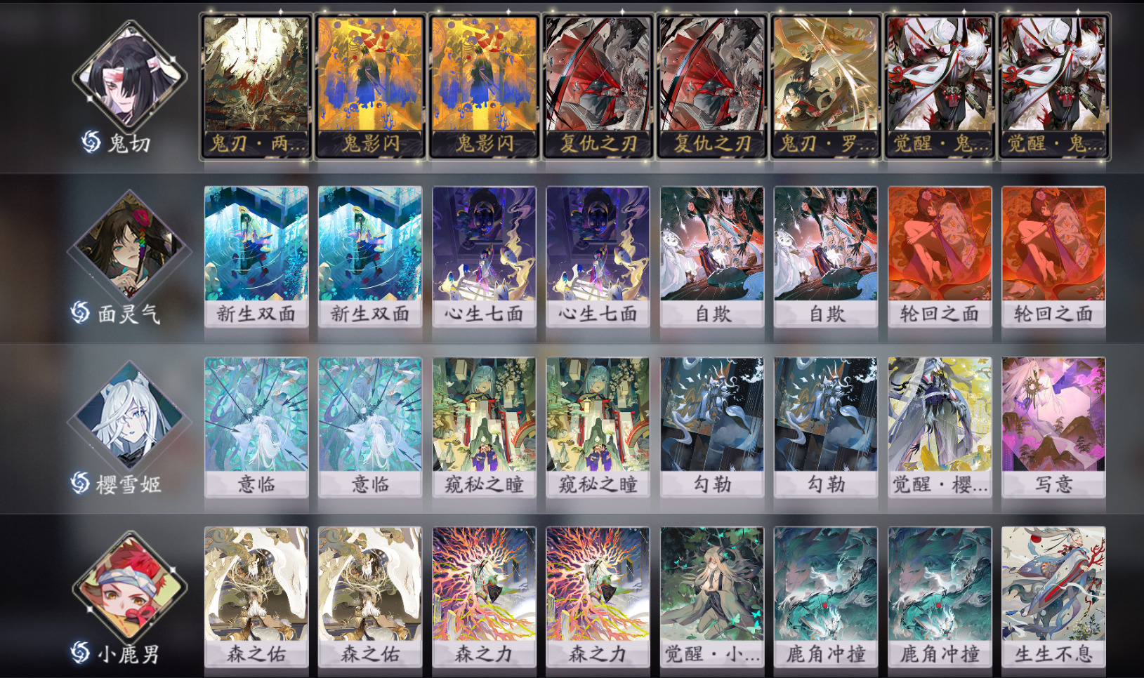 阵容名: 鬼切 鬼刃·罗城门 (1) 复仇之刃 (2) 觉醒·鬼切 (2) 鬼刃·两断 (1) 鬼影闪 (2) 面灵气 新生双面 (2) 心生七面 (2) 自欺 (2) 轮回之面 (2) 樱雪姬 觉醒·樱雪姬 (1) 写意 (1) 意临 (2) 窥秘之瞳 (2) 勾勒 (2) 小鹿男 鹿角冲撞 (2) 生生不息 (1) 觉醒·小鹿男 (1) 森之佑 (2) 森之力 (2) 阵容码:Ml8xMDFfNDg3NjUxNV8xNjE5MTUzNjc4fHp4AAACAAAABkUBAApFAQASRQEAGkUBAMr+AADN/gAA0f4AALr+AAC+/gAAiUMBAI1DAQB2QwEAekMBAH5DAQCFKgEAiioBAI4qAQB1KgEAeioBAA== 如果想要使用此阵容,可将阵容码复制到剪贴板,然后在“新建阵容”里点击“使用阵容码”进行粘贴。
