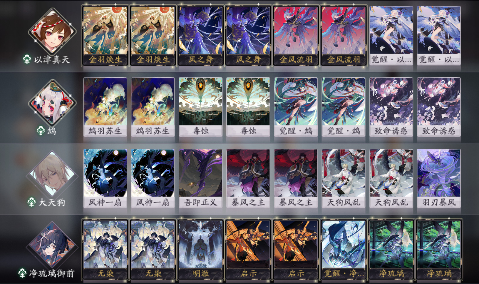 阵容名: 以津真天 觉醒·以津真天 (2) 风之舞 (2) 金羽焕生 (2) 金风流羽 (2) 鸩 致命诱惑 (2) 鸩羽苏生 (2) 毒蚀 (2) 觉醒·鸩 (2) 大天狗 风神一扇 (2) 羽刃暴风 (1) 吾即正义 (1) 暴风之主 (2) 天狗风乱 (2) 净琉璃御前 净琉璃 (2) 无染 (2) 明澈 (1) 启示 (2) 觉醒·净琉璃御前 (1) 阵容码:Ml8xMDFfNDg3NjUxNV8xNjE5MjI0NzEzfHp4AAACAAAAIqQAACmkAAAxpAAAGqQAAB6kAABSwAAAVsAAADrAAAA+wAAAYrUAAEq1AABStQAAVrUAAAJCAQDmQQEA6UEBAO5BAQD5QQEA 如果想要使用此阵容,可将阵容码复制到剪贴板,然后在“新建阵容”里点击“使用阵容码”进行粘贴。
