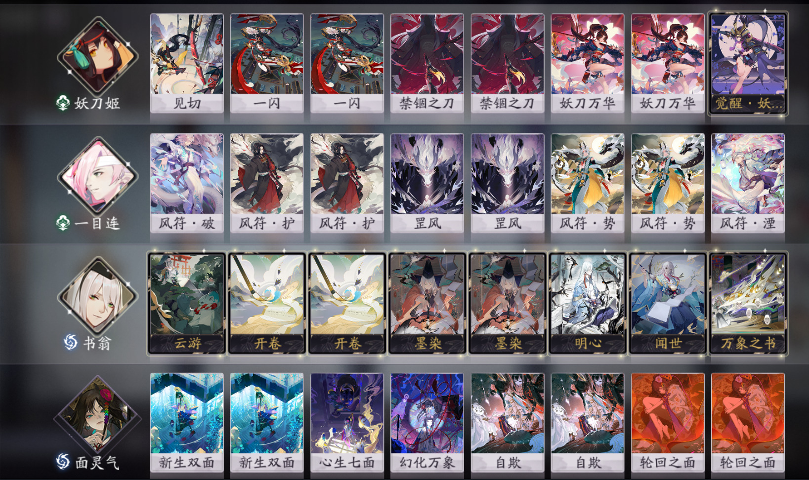 阵容名: 妖刀姬 一闪 (2) 妖刀万华 (2) 觉醒·妖刀姬 (1) 禁锢之刀 (2) 见切 (1) 一目连 风符·破 (1) 风符·护 (2) 罡风 (2) 风符·势 (2) 风符·湮 (1) 书翁 明心 (1) 闻世 (1) 万象之书 (1) 云游 (1) 开卷 (2) 墨染 (2) 面灵气 新生双面 (2) 心生七面 (1) 幻化万象 (1) 自欺 (2) 轮回之面 (2) 阵容码:Ml8xMDFfNDg3NjUxNV8xNjE5MjI0MzM4fHp4AAACAAAABkUBAAlFAQANRQEAEkUBABpFAQDinQAA5p0AAO2dAADynQAA2Z0AAGW4AABquAAAbrgAAHK4AAB1uAAAAboAAAW6AAAJugAADboAAPa5AAD+uQAA 如果想要使用此阵容,可将阵容码复制到剪贴板,然后在“新建阵容”里点击“使用阵容码”进行粘贴。