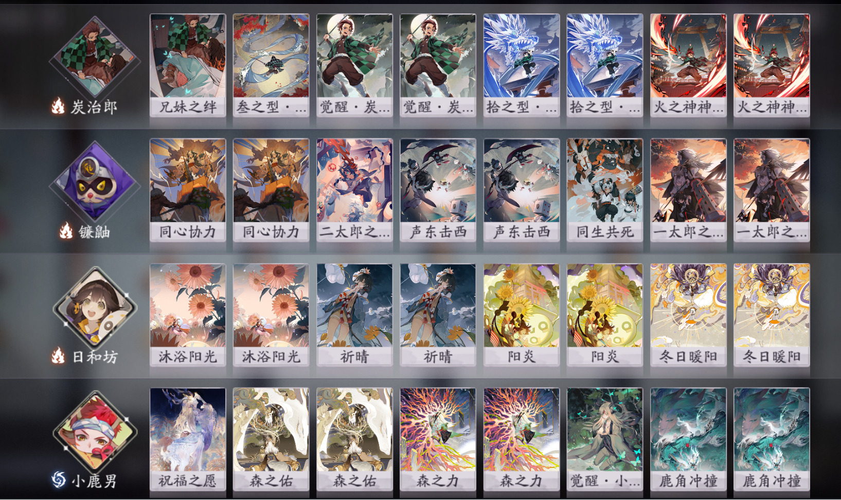 阵容名: 炭治郎/祢豆子 火之神神乐 (2) 兄妹之绊 (1) 叁之型·流流舞 (1) 觉醒·炭治郎 (2) 拾之型·生生流转 (2) 镰鼬 二太郎之戟 (1) 声东击西 (2) 同生共死 (1) 一太郎之棒 (2) 同心协力 (2) 日和坊 沐浴阳光 (2) 阳炎 (2) 祈晴 (2) 冬日暖阳 (2) 小鹿男 鹿角冲撞 (2) 觉醒·小鹿男 (1) 祝福之愿 (1) 森之佑 (2) 森之力 (2) 阵容码:Ml8xMDFfNDg3NjUxNV8xNjE5MTgwOTUxfHp4AAACAAAAyv4AANH+AAC1/gAAuv4AAL7+AADhzwAA5s8AAOnPAADyzwAA2s8AAIIcAQBpHAEAbRwBAHIcAQB6HAEAZgMBAGoDAQBuAwEAcgMBAA== 如果想要使用此阵容,可将阵容码复制到剪贴板,然后在“新建阵容”里点击“使用阵容码”进行粘贴。