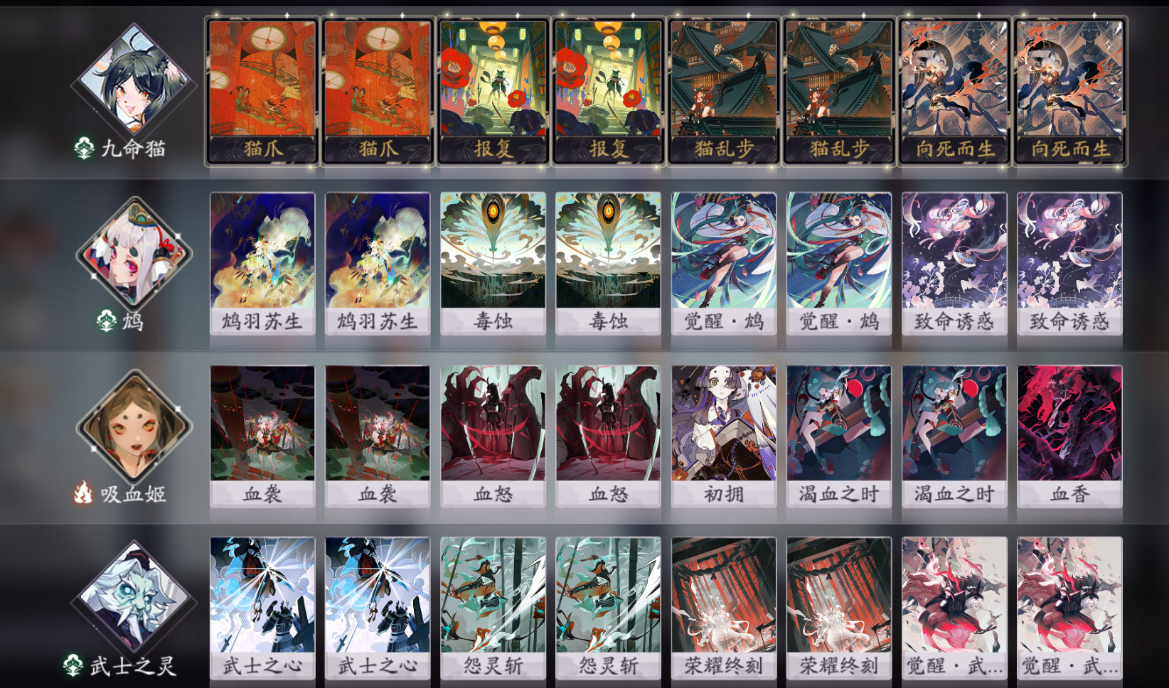 阵容名: 九命猫 报复 (2) 猫乱步 (2) 向死而生 (2) 猫爪 (2) 鸩 致命诱惑 (2) 鸩羽苏生 (2) 毒蚀 (2) 觉醒·鸩 (2) 吸血姬 初拥 (1) 渴血之时 (2) 血香 (1) 血袭 (2) 血怒 (2) 武士之灵 荣耀终刻 (2) 怨灵斩 (2) 觉醒·武士之灵 (2) 武士之心 (2) 阵容码:Ml8xMDFfNDg3NjUxNV8xNjE5MTUzNjc4fHp4AAACAAAAJjoBACo6AQAuOgEAFjoBAGK1AABKtQAAUrUAAFa1AABhDgEAZg4BAGkOAQBWDgEAXg4BAKYtAQCqLQEAsi0BAJYtAQA= 如果想要使用此阵容,可将阵容码复制到剪贴板,然后在“新建阵容”里点击“使用阵容码”进行粘贴。