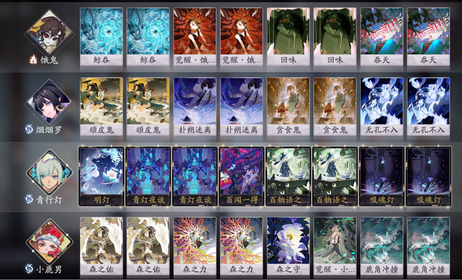 阵容名: 饿鬼 鲸吞 (2) 回味 (2) 吞天 (2) 觉醒·饿鬼 (2) 烟烟罗 顽皮鬼 (2) 贪食鬼 (2) 扑朔迷离 (2) 无孔不入 (2) 青行灯 吸魂灯 (2) 百物语之火 (2) 明灯 (1) 青灯夜谈 (2) 百闻一得 (1) 小鹿男 森之守 (1) 鹿角冲撞 (2) 觉醒·小鹿男 (1) 森之佑 (2) 森之力 (2) 阵容码:Ml8xMDFfNDg3NjUxNV8xNjE5MjI1NDI3fHp4AAACAAAAIlMBACpTAQAuUwEAMlMBAMX+AADK/gAA0f4AALr+AAC+/gAARgABAE4AAQBSAAEAXgABAK7JAACyyQAAlckAAJrJAACdyQAA 异画:engAADGyEwA= 如果想要使用此阵容,可将阵容码复制到剪贴板,然后在“新建阵容”里点击“使用阵容码”进行粘贴。