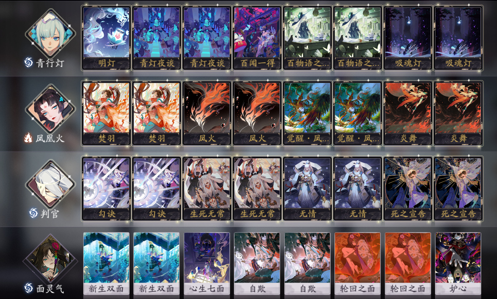 阵容名: 青行灯 吸魂灯 (2) 百物语之火 (2) 明灯 (1) 青灯夜谈 (2) 百闻一得 (1) 凤凰火 觉醒·凤凰火 (2) 焚羽 (2) 凤火 (2) 炎舞 (2) 判官 勾诀 (2) 生死无常 (2) 无情 (2) 死之宣告 (2) 面灵气 妒心 (1) 新生双面 (2) 心生七面 (1) 自欺 (2) 轮回之面 (2) 阵容码:Ml8xMDFfNDg3NjUxNV8xNjE5MjI1MjE4fHp4AAACAAAAIUUBAAZFAQAJRQEAEkUBABpFAQCuyQAAsskAAJXJAACayQAAnckAAKq+AACuvgAAsr4AALa+AADiwQAAzsEAANLBAADWwQAA 异画:engAADGyEwA= 如果想要使用此阵容,可将阵容码复制到剪贴板,然后在“新建阵容”里点击“使用阵容码”进行粘贴。