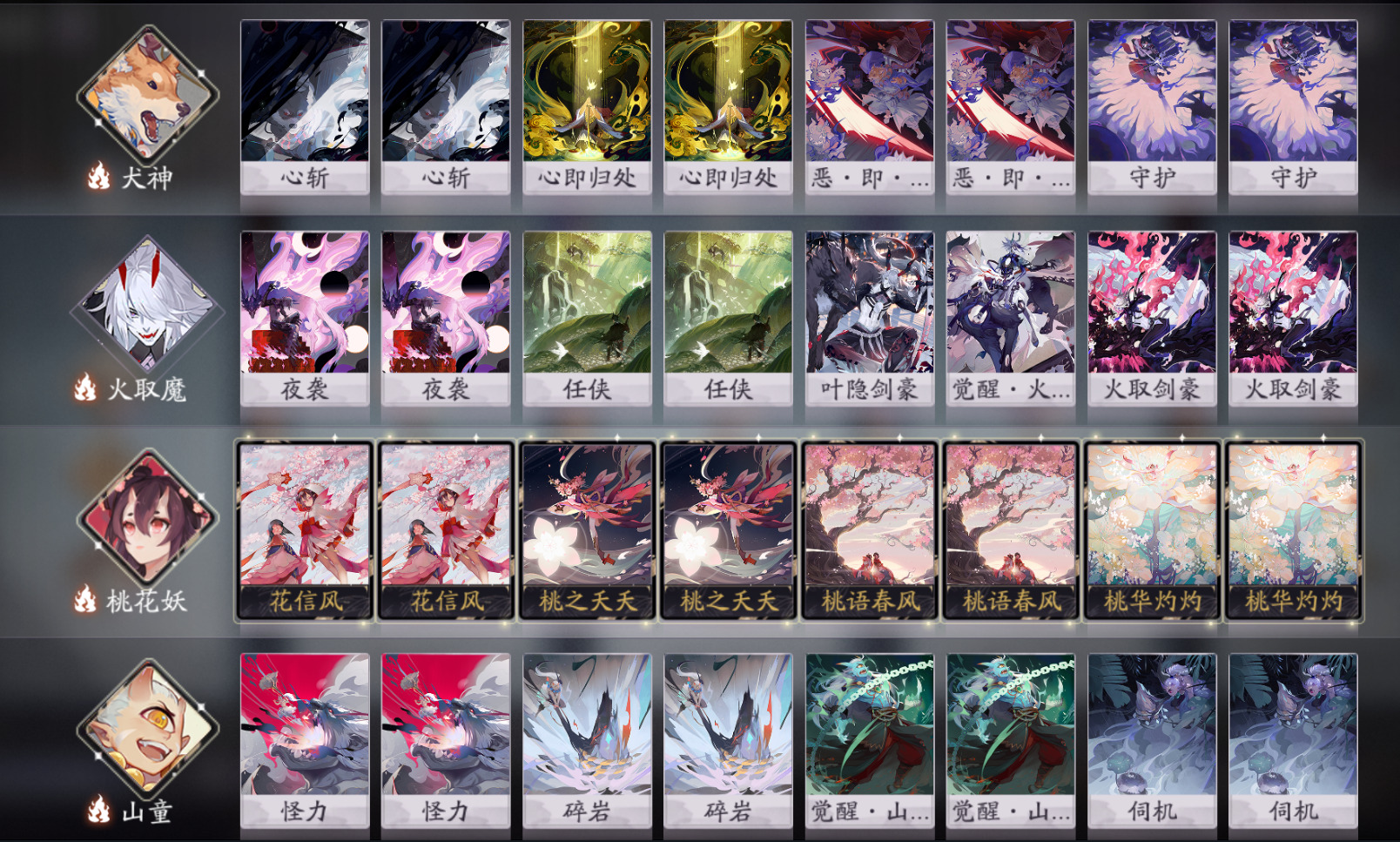 阵容名: 犬神 恶·即·斩 (2) 守护 (2) 心斩 (2) 心即归处 (2) 火取魔 火取剑豪 (2) 夜袭 (2) 任侠 (2) 叶隐剑豪 (1) 觉醒·火取魔 (1) 桃花妖 桃语春风 (2) 花信风 (2) 桃之夭夭 (2) 桃华灼灼 (2) 山童 碎岩 (2) 觉醒·山童 (2) 伺机 (2) 怪力 (2) 阵容码:Ml8xMDFfNDg3NjUxNV8xNjE5MjI0OTMyfHp4AAACAAAAIr0AADa9AAAavQAAHr0AAOI+AQDGPgEAzj4BANU+AQDZPgEA4qgAAMqoAADOqAAA3qgAAKawAACusAAAsrAAAJqwAAA= 如果想要使用此阵容,可将阵容码复制到剪贴板,然后在“新建阵容”里点击“使用阵容码”进行粘贴。