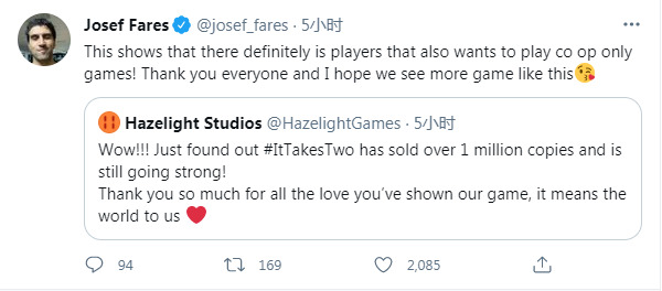 备受玩家好评的双人合作游戏《双人成行(It Takes Two)》于3月27日发售,如今其开发商宣布本作销量现已正式突破100万份,游戏制作人的在推特对玩家们表示了感谢!
