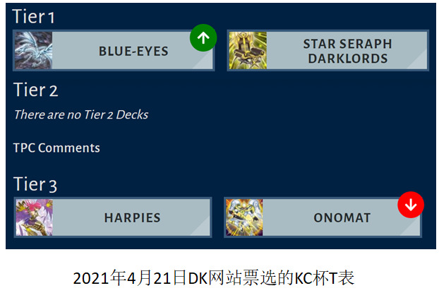 2021年4月21日,DK网站票选的KC杯T表,这个表上的内容看似十分简单,仅有4套卡组,即白龙卡组、杖座堕天使卡组、鹰身卡组和拟声卡组,但也反映了目前环境中的部分情况,的确,这四套卡组的确是目前环境中出场率最高的四套卡组,尤其是白龙卡组和杖座堕天使卡组几乎在天梯中会有50%的概率遇到两者中的一者,鹰身卡组和拟声卡组可以达到30%的出现率,留给其他卡组的出场率则进一步被压榨,而卡组强度来说,四套卡组各有特点,也都是十分难缠的(不过我个人感觉白龙是当中最弱的,只是数量太多基数太大而已,从本次KC杯前百卡组中白龙卡组的使用数量也能看出一些问题)。