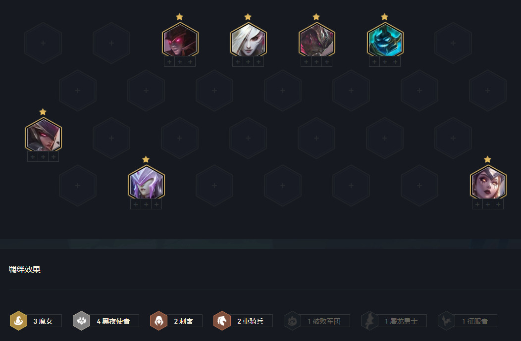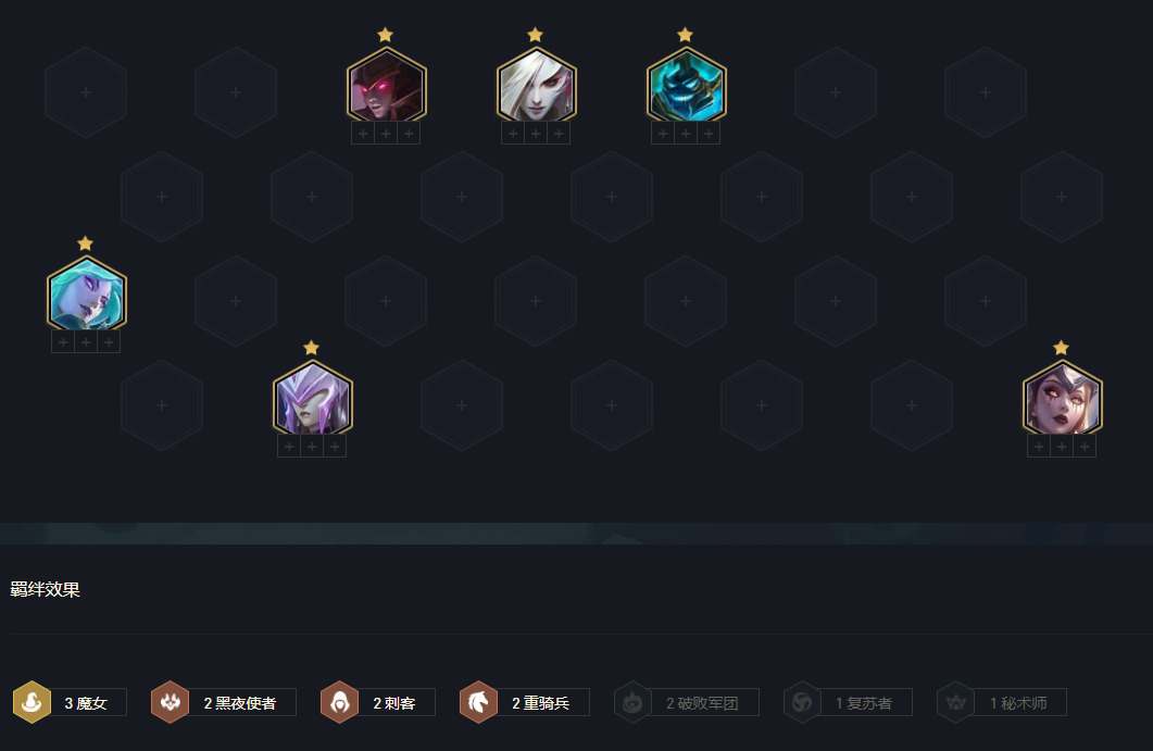 阵容属于大羁绊阵容,关键就是6黑夜与三魔女。阵容主C莫甘娜,副C月男,主坦诺手。