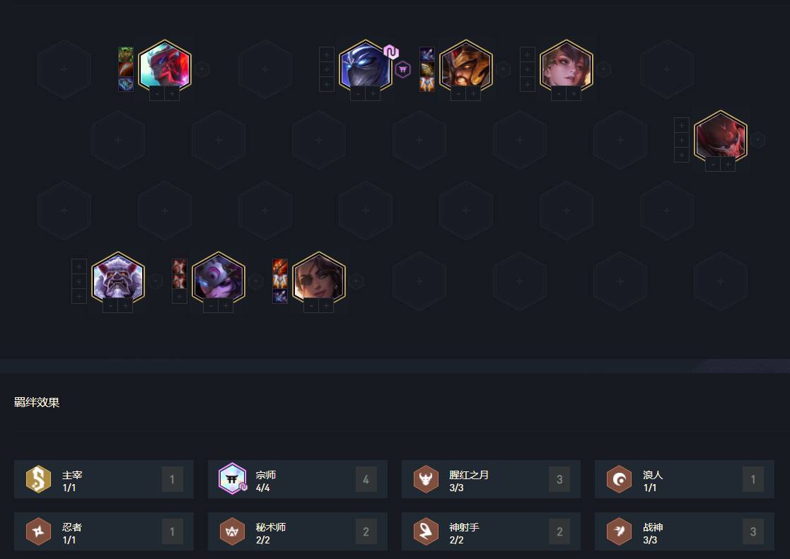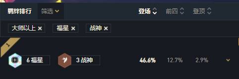 战神体系阵容这周依然是热门阵容,总共进入前三场次18场,最为强势则是宗师战神沙弥拉与蛮王主C的阵容7场进入前三三场吃鸡;而重装战神玩的人还是最多的,虽说前三场次与宗师战神场次相同,但吃鸡场次一局没有;6战神则是3种强势战神阵容种最稳定的阵容4场前三竟然有三场吃鸡,稳的一P。而上周统计种大火的4决战神这周则一场没见。大家在赛季末玩战神阵容摩昂还是比较推荐宗师战神与6战神。拉夫还是较为刮痧,