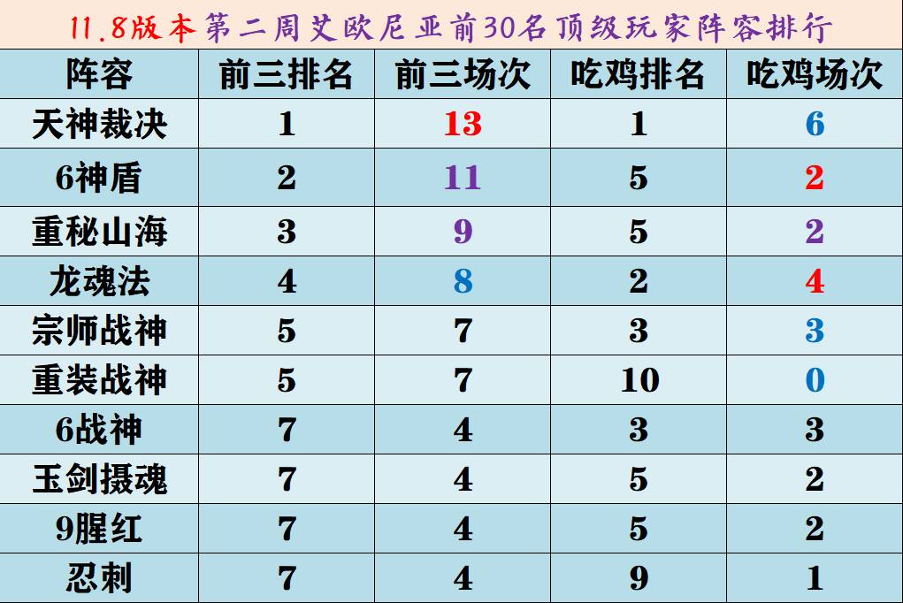 另外一个则是龙魂法,上周龙魂法阵容没有进入排行榜前10,这周一举冲到了前四名。且吃鸡场次排名第二,异常强势。