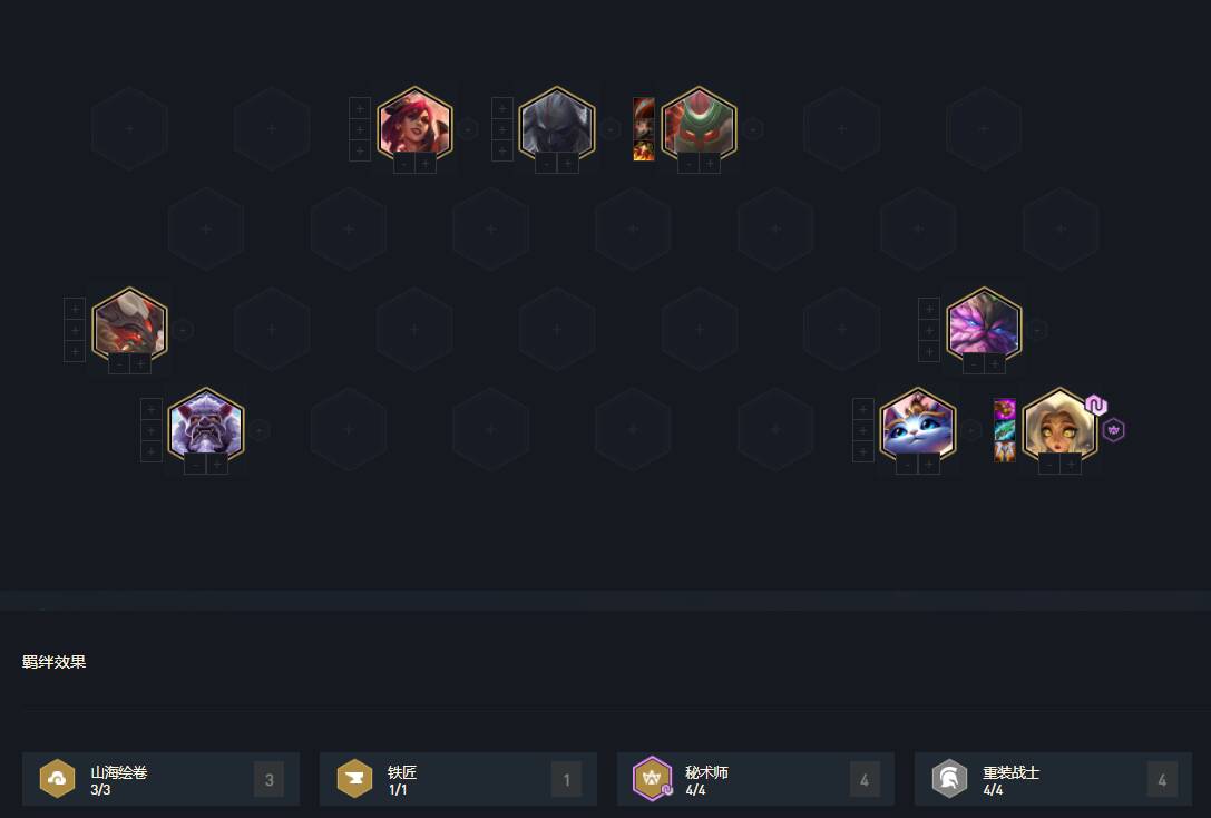 山海重秘在上周登顶后,这周掉落到第三名位置,统计中选择山海阵容的玩家与上周相比少了能有1/3,选择的人少了但吃分比例依然较高且追三星变的容易了,统计中出现3次双3星山海重秘。由于宗师阵容增多,山海阵容吃鸡场次大大下降。