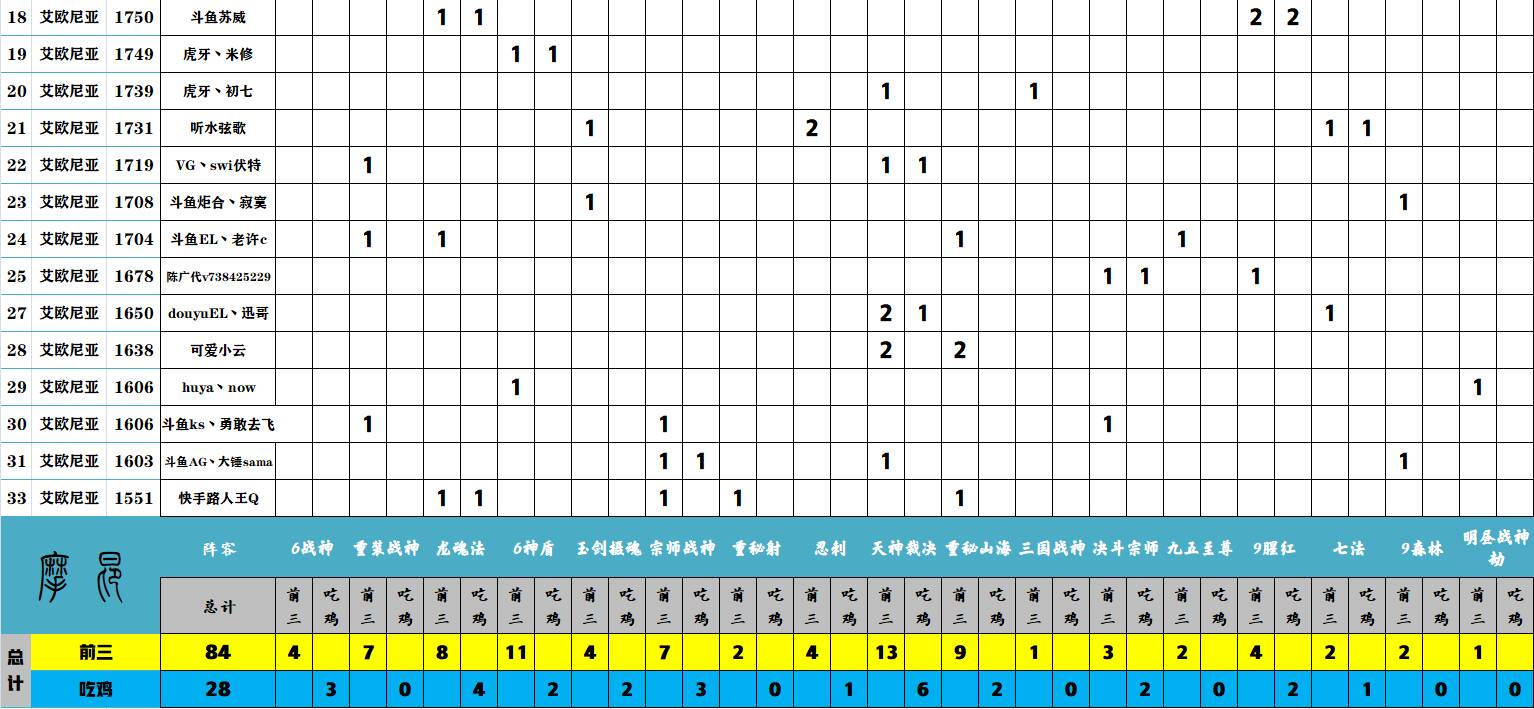 本次摩昂统计了4月19日更新后到4月25日统计时的艾欧尼亚服务器排名前30名玩家的最近5场排位赛(无对局场次,或不够5场排位赛或5长均未进入前三,名次顺延),只统计进入前3名的局。