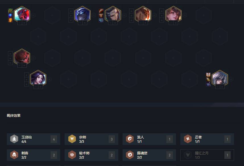 这周外服黑马阵容为老阵容玉剑宗拼,但输出点从莫甘娜、男刀2输出点变为了男刀、永恩+莫甘娜、乌鸦4C组合,主力输出为男刀与永恩,吃分与吃鸡率均非常高,但在阵容选择率上却极低只有0.09,摩昂最近没玩外服,不知道这是不是阵容的昙花一现。