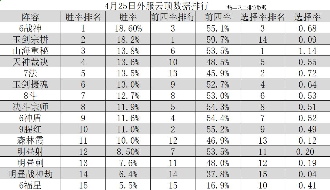 本周外服选择率前三阵容:山海重秘、7法、6战神。