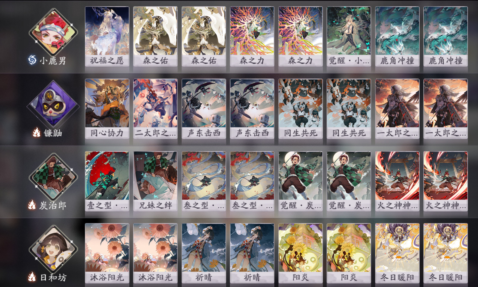 22号新版本,青缘与苍叶快均被削弱,暂时出现面切一方独霸的现状,不过能量队得到了一波小加强,使其强度大大提升,足以在天梯中有一席之地。 日和坊是能量队的核心,为全体式神提供能量身材并且有较强的过牌能力,阳炎我个人认为是最强的卡节奏的牌,在现今版本也是非常重要的一张牌。小鹿男的鹿角冲撞在该版本特别强势,而在能量队中,小鹿男更易于打出8点爆能的冲撞,既能用于斩杀,也能用于回血,在能量队中主要担任着前排的作用。新版本镰鼬得到了一波较大的加强,声东击西虽然攻击对象是随机的,但是高额的攻击力能够保证我方能够打脸或者稳定解掉一个式神,相对比之前只能用于响应的声东击西有着质的飞跃,同心协力的加强也避免了该牌的卡手,使得镰鼬的使用较为顺滑,声东击西也使得镰鼬有着较强的站场能力,使得镰鼬既有站场能力又有斩杀能力。最后一个式神在炭治郎和御馔津之间做选择,因为该版本一些式神身材比较超模而且解场牌较多,御馔津如果没有2勾形态很难以打出伤害,更多是承担着解场的作用,而炭治郎的进攻性和防御性比较强,整体表现比较全面,后期也能依赖火之神神乐的必杀抢血,所以最后选择了炭治郎作为新能量队的第四人。