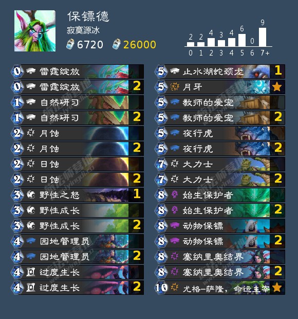单卡方面首先是始生保护者,基本稳定过8费牌+召唤一个8费优质生物,当前版本八费随从质量普遍不错。其次是园地管理员,因为打骑士和猎人经常扛不住前期伤害,所以选择的保命牌,另外也可以补足雷霆绽放后过载回合的空缺,不至于变脸空过。选择塞纳里奥结界的思路和866相似,同时作为法术的它还可以搭配日食,做到保命的同时站场。大力士是为了在一个回合内给足压力以及嘲讽护脸,我对战骑士时候对方通常会在我开始超展开的时候选择抢血,一个66嘲讽还是可以很好的苟活的。活下来之后在卡组无与伦比的高质量压制下,对手就很难翻盘了。