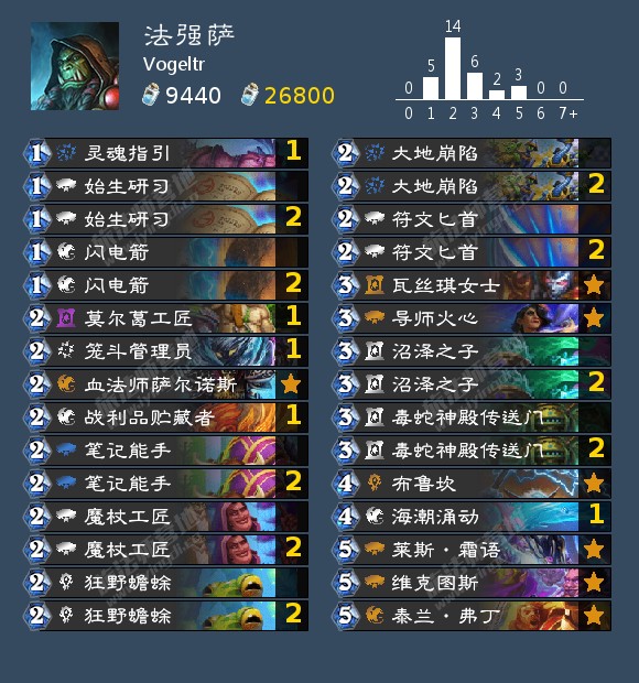 来自营地用户Vogeltr投稿的一套法强萨,他使用这套卡组从天梯40000名打到了天梯9000名。卡组的前期主要思路围绕随从与法术的展开,在按费拍怪的同时可以利用一些随从的战吼补充法术并且利用这些法术来争夺场面优势。即便面对一些前期较为强势的卡组站不住场面,中期也可以通过法强buff和大地崩陷或者莱斯·霜语的配合达到清场或者返场。只要能够蹭掉对方8点血,后期等布鲁坎、两张闪电箭和毒蛇神殿传送门全部上手后配合符文匕首可以一回合打出22点伤害,而携带泰兰·弗丁的用意也在于此——他可以让布鲁坎更早地上手。这套卡组面对骑士和术士都占据优势,而对抗健身战和DH有些乏力,与牧师的对局则取决于对方裂心者伊露希亚的上手。总的来说这是一套强度尚可值得一试的卡组,推荐给大家使用。