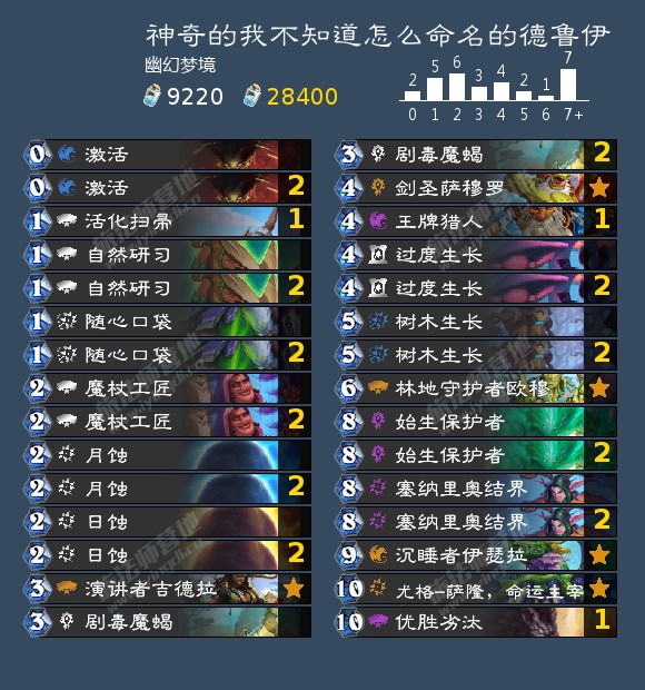 来自幽幻梦境的一套神奇的我不知道怎么命名的德鲁伊,他前几日使用这套卡组以65左右胜率打到了传说98名。