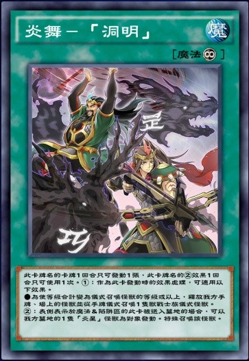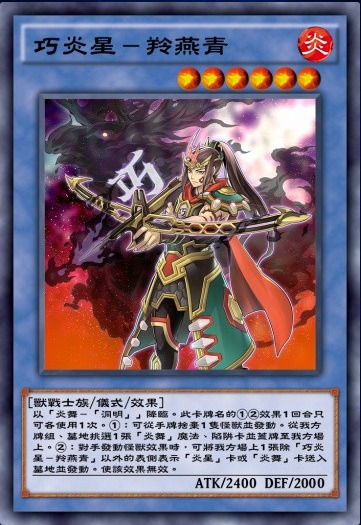 同样来自TCG先行的炎星加强卡,羚燕青对应的是水浒传的浪子-燕青。虽然本身是仪式怪兽,但是因为炎星卡组的特殊性,其仪式所用的是【炎舞】也是永续魔法,很容易检索,所以其出场简单。①效果是堆墓+回收墓地【炎舞】魔陷,②效果是一个二速怪兽效果康,很实用。