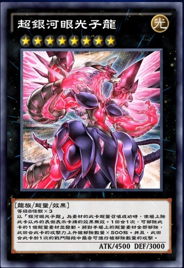 本次的封面怪兽,快斗的王牌怪兽【银河眼光子龙】的升级马甲之一,突出一个帅气!!!虽然本身为泛用R8,但是等级8怪兽x3的召唤条件,着实有点亏卡,更何况超银河眼的进场技抽的效果必须以【银河眼光子龙】做超量素材才能触发,其他卡组,比如白龙卡组用3只白龙做一个这卡和用融合出一个真青眼究极龙其实没什么区别。后续效果延续了银河眼超量杀手的设定,拔自己一个垫子吃对手所有的垫子,提升攻击力不说,还能根据吃掉垫子的数量,在一次战斗阶段做多次攻击,用的好的话,这可比三重人强太多了,这可是能直接攻击的啊。