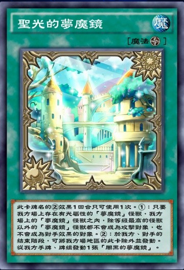梦魔镜核心运转场地之二-光镜。①效果,可以给我方场上等级最高的的梦魔镜怪兽提供一个不会成为攻击对象和不会被取对象的抗性,但是如果等级最高的怪兽有两只,那这个效果就木用了,所以千万黑白骑士互保的情况是不会出现的。②效果和魔镜相反,除外自己换成魔镜。