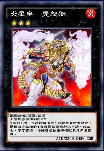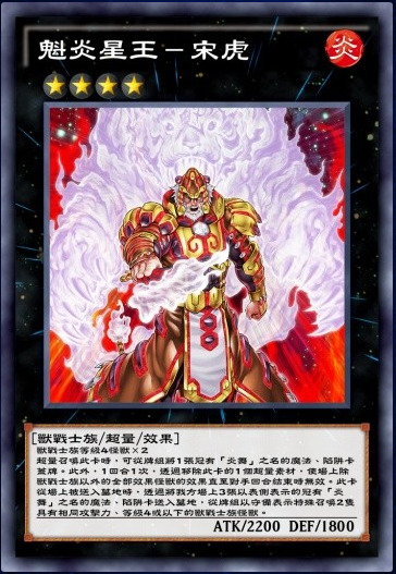 炎星本家绝对的大哥(其实兽战士族也可以很容易出啦),对应水浒传的呼保义—宋江。超量成功从牌组盖放一张【炎舞】魔陷到场上。拔一个垫子,可以无效场上除了兽战士族以外所有的怪兽效果,等于兽战士族的单方面技抽啊,而且这个效果能持续到对手回合结束。但是只能无效这个效果适用时的那些在场上表侧表示存在的 兽战士族以外的效果怪兽,不会影响这个效果适用后再出现在场上的效果怪兽 。
