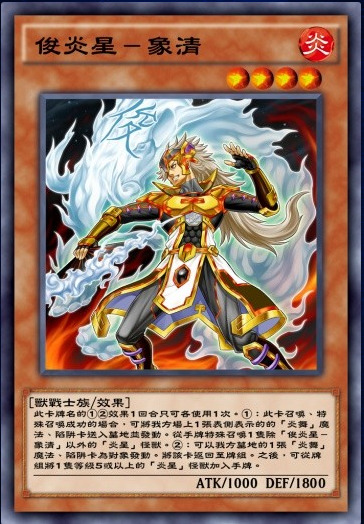 TCG先行的炎星新卡,对应的是水浒传的铁扇子—宋清,宋江的弟弟。可以用天玑检索此卡,然后通召此卡用①效果把天玑送墓特召手牌另一只4星的炎星怪兽。然后用②效果把天玑返回卡组,检索【威炎星-飞燕灼 】或【机炎星-吴郊狼 】(其实还有一个新卡【寿炎星-李熊猫 】,很强,可惜这次没出)。最后两只等级4的炎星叠放出【 魁炎星王-宋虎 】。整个说书过程,展开、回收、赚卡兼备,不可多得的炎星大腿卡,满3满3满3!!!