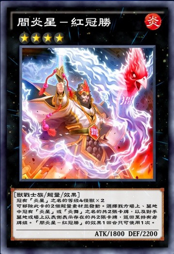 红冠胜对应的是水浒传的入云龙-公孙胜。炎星本家R4,效果是取对象弹对手场上表侧表示的卡或者墓地的卡回卡组,而且是可以利用自己墓地名字带有【炎星】或者【炎舞】之名的卡的。总得来说就是我方回收资源,解对手的场或者干扰对手的墓地。非常不错的本家终端之一。