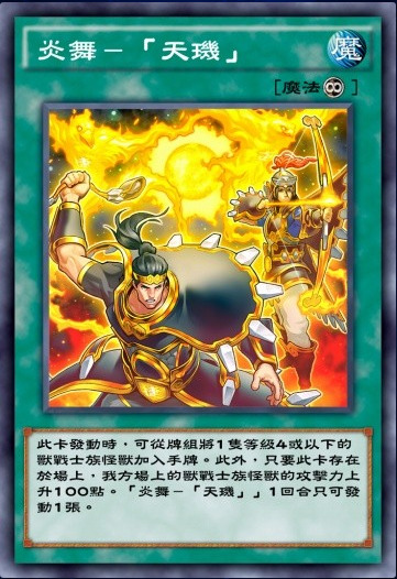 你没有看错,曾经在OCG里带领十二兽卡组走向毁灭的兽战士族泛用检索—炎舞天玑,竟然登录DL了!!!这张卡的登录除了对炎星的加强,还可以带动DL里已经有的如武神、炎王、月光等兽战士族相关卡组。天玑的强力,已经让k社对月光提前下手了,足以见其强度。