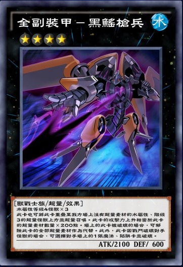 黑鳐枪兵的升级版马甲,可以直接叠在没有超量素材的我方水属性R3怪兽上方特召。没错,不能用黑鳐枪兵叠,因为它是暗属性。。。本身有一个用全部超量素材代破的抗性,还不错。战破对手炸魔陷的效果挺一般的。