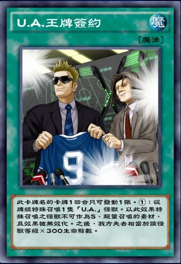 UA本次加强的大腿卡之二,同样可以被罚球室检索。可以解决本家目前唯一下级怪兽【U.A. 九球半球员】不上手的问题,有效提高卡组初动。而且只需要付出4x300=1200生命值的代价而已。甚至特召本家其他上级怪兽,如常用的5星击球手/王牌投手和7星篮板手付出的代价也不算很高。虽然用这个效果特召的怪兽不能用于同调和超量,但是用本家其他怪兽效果回手牌后,那就不受这个限制了。