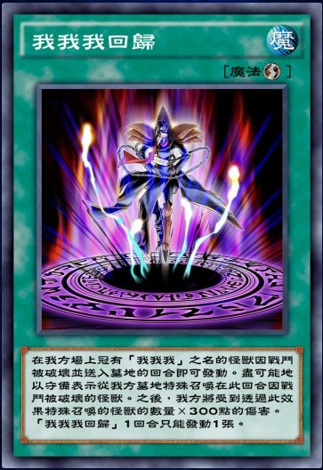 【我我我】本家一张不错的苏生卡,副作用因为DL特殊的规则反而是减少了受到的效果伤害。但是局限性太大。只能苏生【我我我】怪兽。