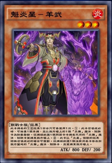羊武对应的水浒传的神机军师-朱武。①效果集堆墓和检索本家魔陷为一体。②效果为特召成功检索一张同名卡不在自己墓地存在的1张本家魔陷。同时他是一个守备力200的炎属性怪兽哦,懂的都懂(#^.^#)