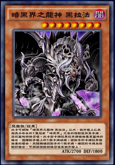 龙神!龙神!龙神!我最爱的暗黑界的龙神,你终于来了!!!龙神的强力我觉得不用多说,大家通读完效果也能体会的到了。暗黑界卡组绝对的大哥,强力终端。要玩卡手界,满3满3满3!!!
