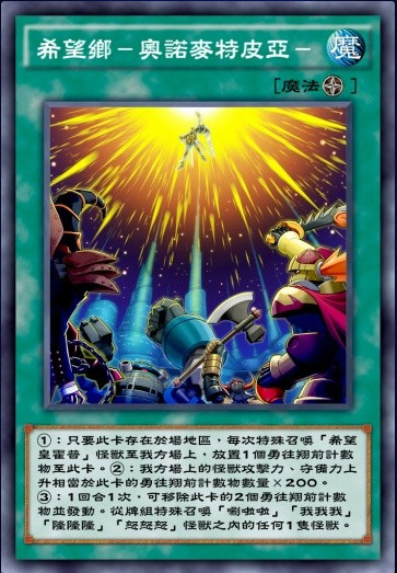 拟声卡组加强卡,卡名翻译的很渣,我还是喜欢用【希望乡-拟声乌托邦】这个译名。这张卡要配合【希望皇 霍普】怪兽的特召来累积一飞冲天指示物,然后靠去除2个一飞冲天指示物特召卡组的4种拟声怪兽。虽说是拟声卡组的加强,但是拟声卡组现在用的都是泛用超量,所以这张卡对于现有拟声卡组的加强几乎是0,估计要等【希望皇 霍普】特化卡组的出现,这张卡才能发挥其价值。