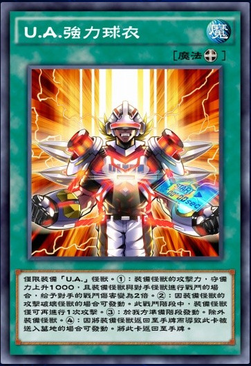 UA本家加强的大腿卡之一,可以被罚球室检索。效果非常多,我简单概括一下:装备怪兽攻守上升1000,造成的战斗伤害翻倍。战阶破怪的话,可以再打一次。配合击球手,我感觉直接可以把对手锤爆。③效果是副作用,但是可以用4星的效果规避。④效果就是配合UA本家回手牌的效果,回收这张强力装备卡。