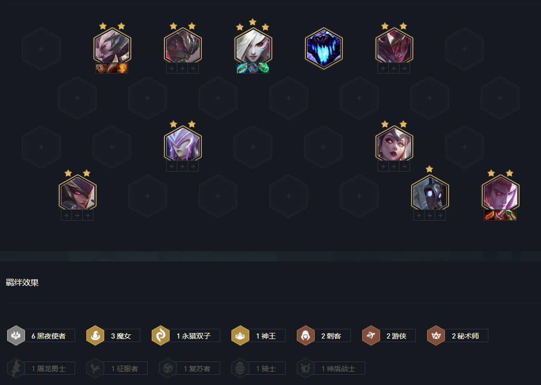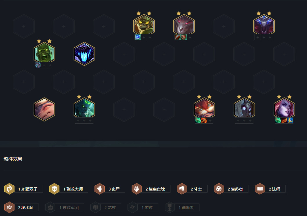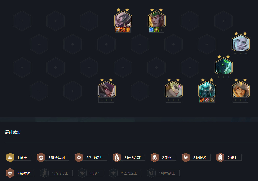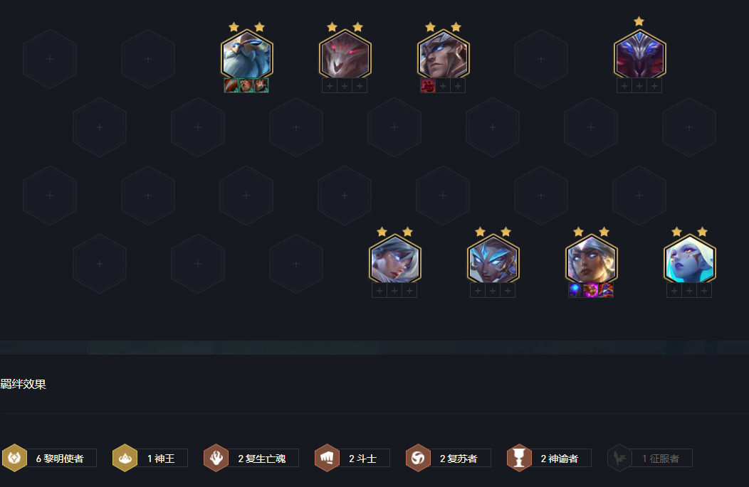 棋子构成:人马、芮尔、锤石、卡特、佛耶戈、瑞兹、德莱文、天使(任意征服)。