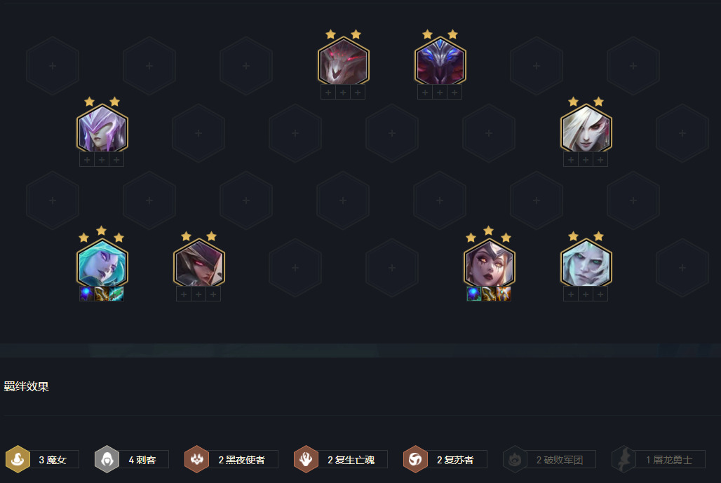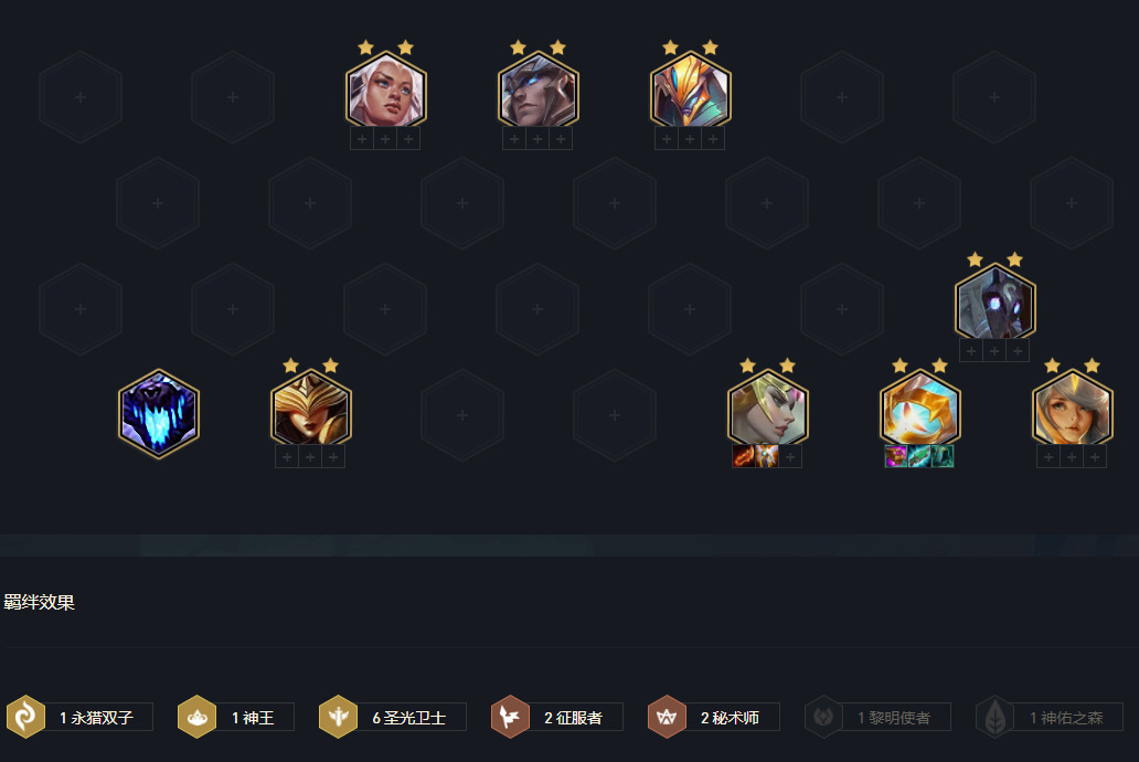 棋子构成:芮尔、盖伦/人马、剑魔、千珏、辛德拉、天使、大眼、拉克丝。