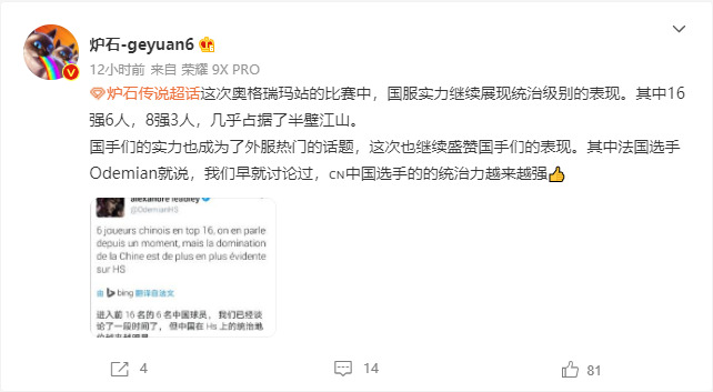 (话说对于geyuan说的外服热议国服实力这一点,我的感受恰恰相反。geyuan转了法国大解说/主播Odemian和美国半职业选手Caravaggio的两条推特,但那两条也基本是全部的讨论了。Caravaggio也不是真的中吹,他更多的是为了骂总部电竞,就像美国两党只会在互相攻击时说中国的好。英语解说们台上夸得多但那是工作,台下也只有Sottle提了句,再加上几个日本选手和解说,Pasca一行人勉强算吹过,Ranlit我并不认为他能算圈内人……和国服在巡回赛上的统治力度比起来这点只言片语完全称不上热议,注意衡量推特讨论热度时不要代入国内圈子发微博的频率;或者说这和欧洲、法国、日本乃至意大利等其他势力崛起的讨论热度也是没法比的。这种“不热议”比热议更耐人寻味,一是西方本来就夸中国夸不出口,二是HCT时代的第一印象,三是外服炉石电竞凉凉。房间里这么大的大象就在那里,但人们就是不说/懒得说)