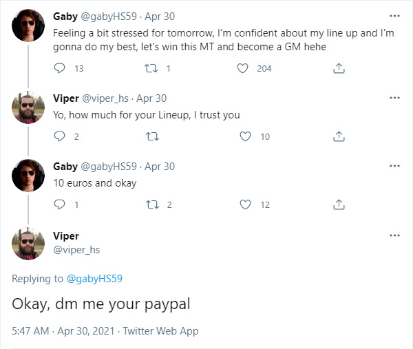 Gaby在这次比赛里证明了的还有他的构筑和备战能力。他最为人熟知的标签是神童,登顶和操作,它们是如此耀眼以至于掩盖了他同样强的构筑微调。但这次比赛他不仅自己夺冠,他的决赛对手Viper也相当于是他一手“栽培”的——赛前Viper在推特上开玩笑似的说要买他的牌表,他也开玩笑似的开价10欧,万万没想到他们的120张牌还真就只差了1张,并且Viper在决赛中也确实给Gaby造成了最大的麻烦……