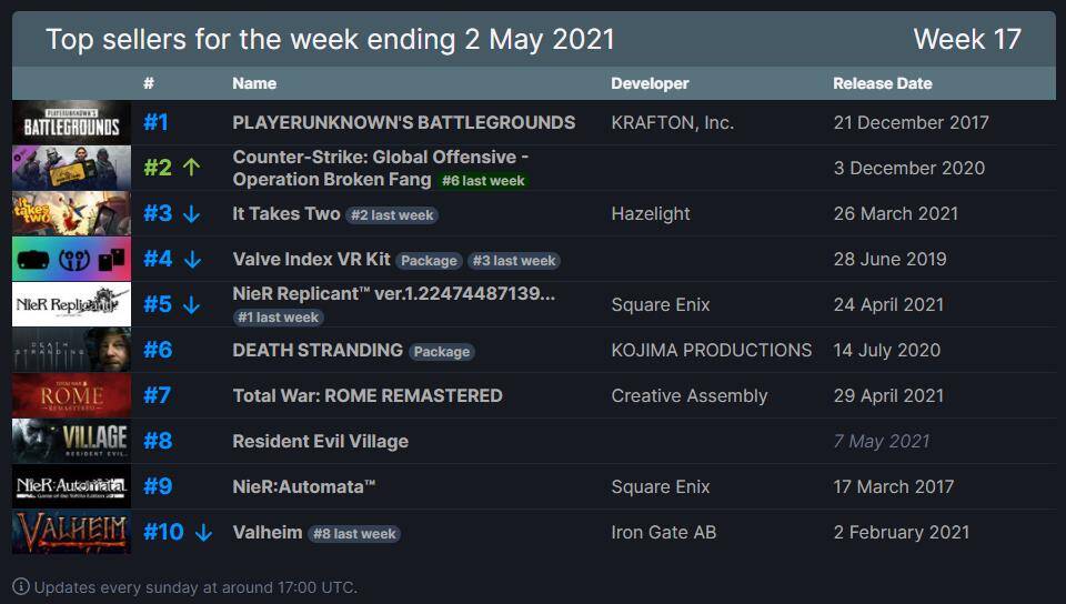 Steam公开新一周销量榜(4月26日—5月2日),本周变化较大,《绝地求生》销量第一,《反恐精英:全球攻势》第二,《死亡搁浅》进入第六的位置,上周冠军《尼尔:人工生命》第五。