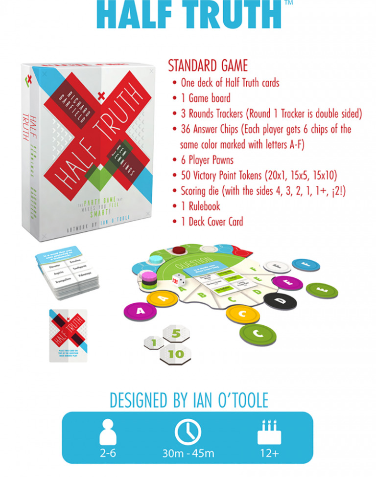 Half Truth是我与Ken Jennings一起制作的知识记忆型游戏,我对它的结果感到非常满意。我的灵感来自Ken的书Brananiac,在读完之后我决心制作一个知识记忆型游戏,让广大的读者都可以玩,并且不会让书呆子总是赢。实际上,当我第一次与Ken共享设计时,他玩了两场比赛,输了第二场。 (不是输给我我,我只是设计了问题!)