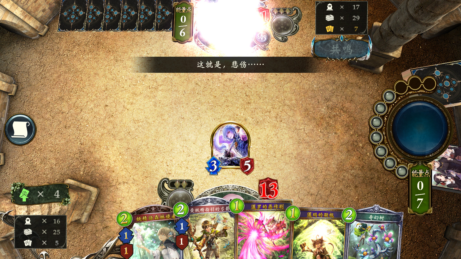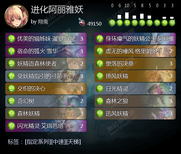 中期优先进化阿丽雅。如果第7回合以后才抽到阿丽雅,则要根据情况选择是否进化她。进化阿丽雅后,通过妖精和萤火解场、蹭血,并留意触发艾珥芭塔的主战者效果,并优先采用叫杀打法。