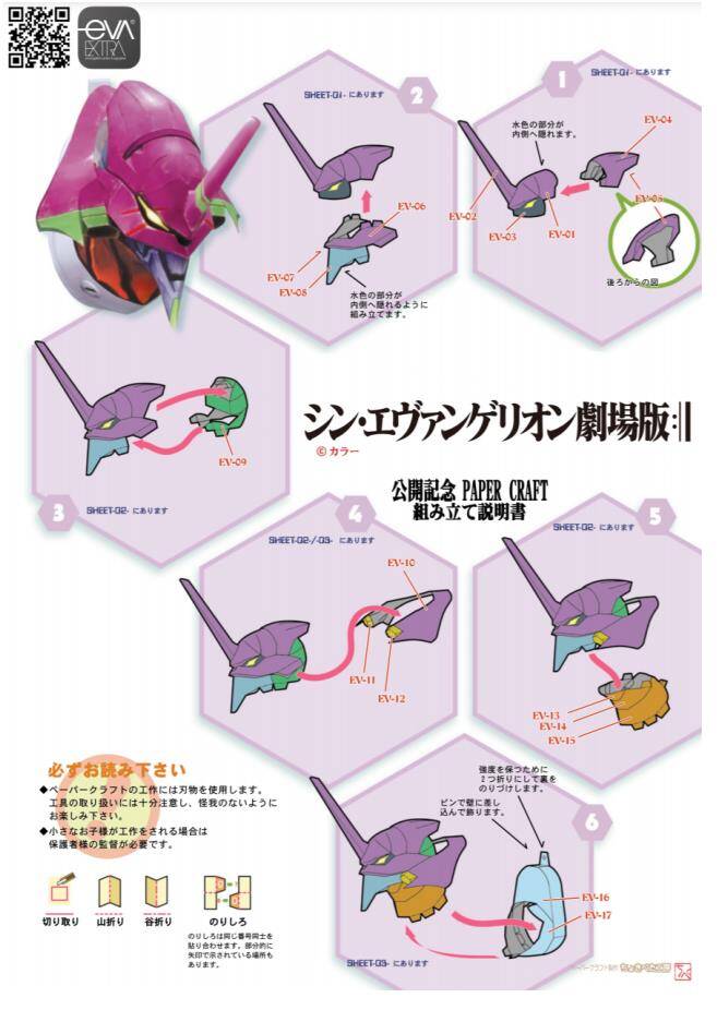 除此之外,官方还有设计另一款初号机头的折纸模型,是14年前剧场版「序」推出时公开的。不过这份就比较小一些,约共四页包含说明书,制作上也非常有趣,组起来约17 cm。