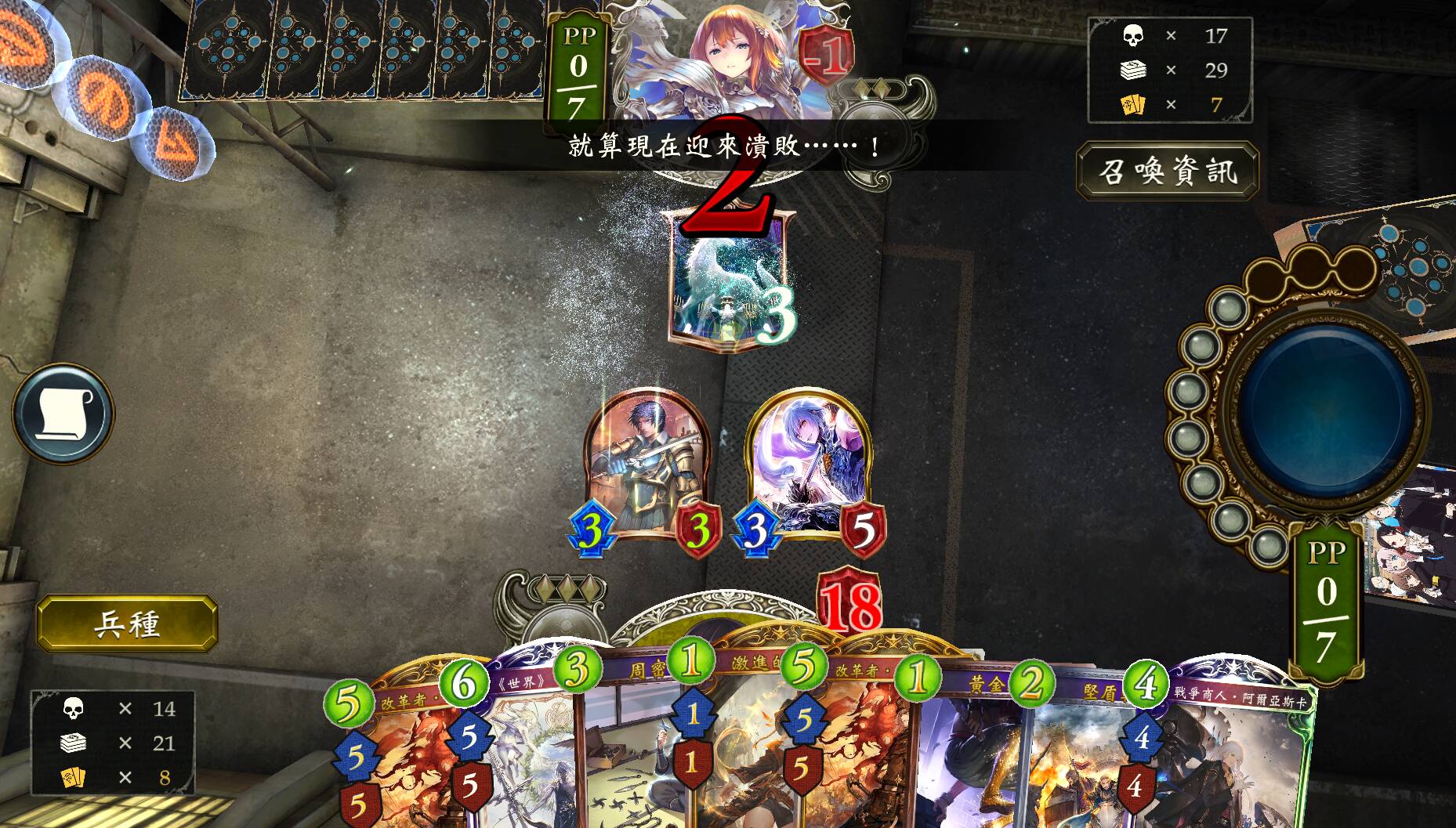 前中期争夺场面。优先采取场面最大化的打法,但也要预测对手可能动作,保留特定手牌来应对,例如对造物仇时,留好堕落的决意处理结晶巨械工厂;对半数法时,留好沉睡的辉龙·亚瑟,等到对手即将斩杀时再使用,获取减伤效果;对载具妖时,留好曙光少女·赛拉,等到对手即将使用套索的拓荒者·洛奇萨斯前再进化;对增幅法、进化鬼时,留好激进的神枪手,用于处理对手的铺场(也可以提前进化战争商人·阿尔亚斯卡获取终战兵器)。