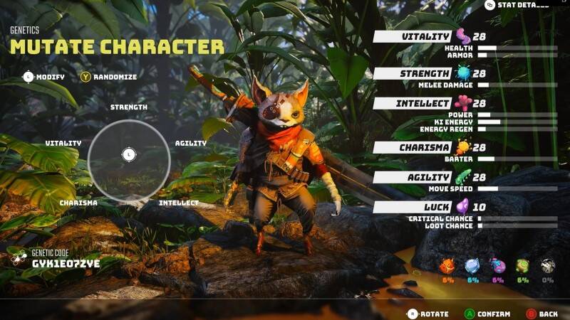 此外,角色还有6种属性:生命力、力量、智慧、魅力、敏捷、幸运,可以分配点数,它们还会对玩家角色的外观有直接影响(比如力量高的角色肌肉更多)。玩家还可以调整角色的抗性基因,分别是抗热、抗寒、抗生化危害、抗辐射,后期这些抗性都可以逐渐提升